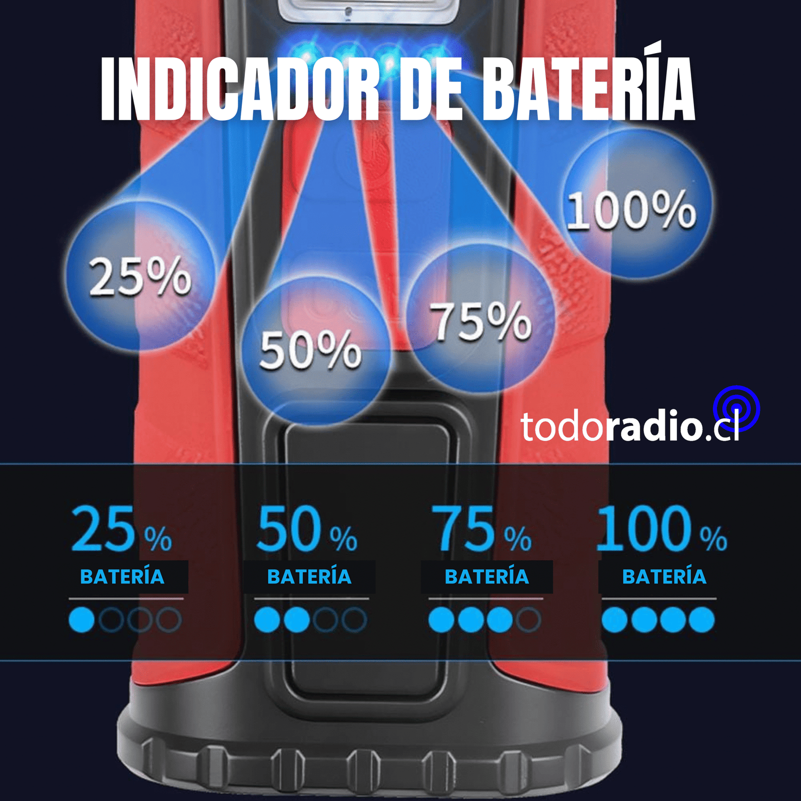 Posee indicador de batería restante, 25%, 50%, 75%, 100%.