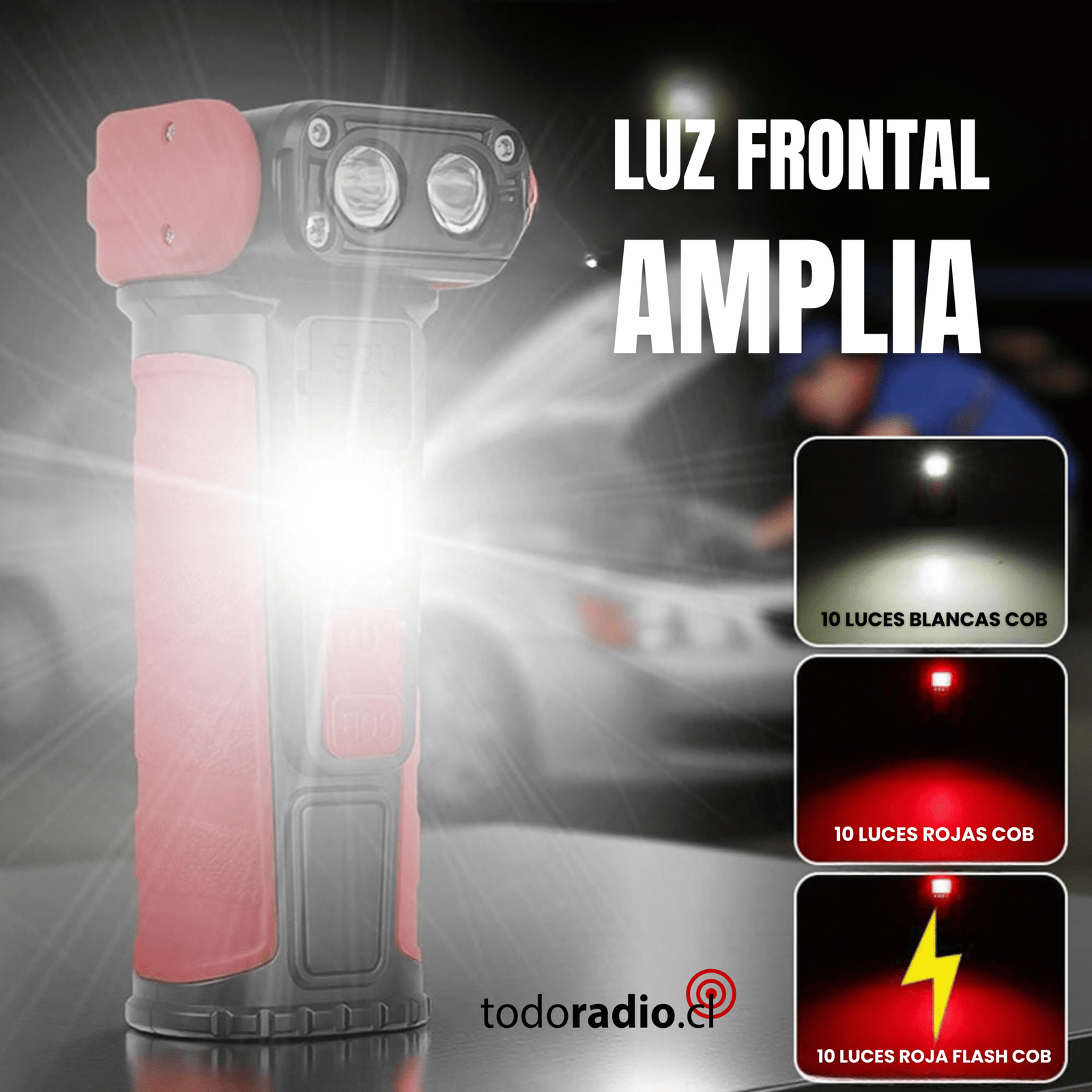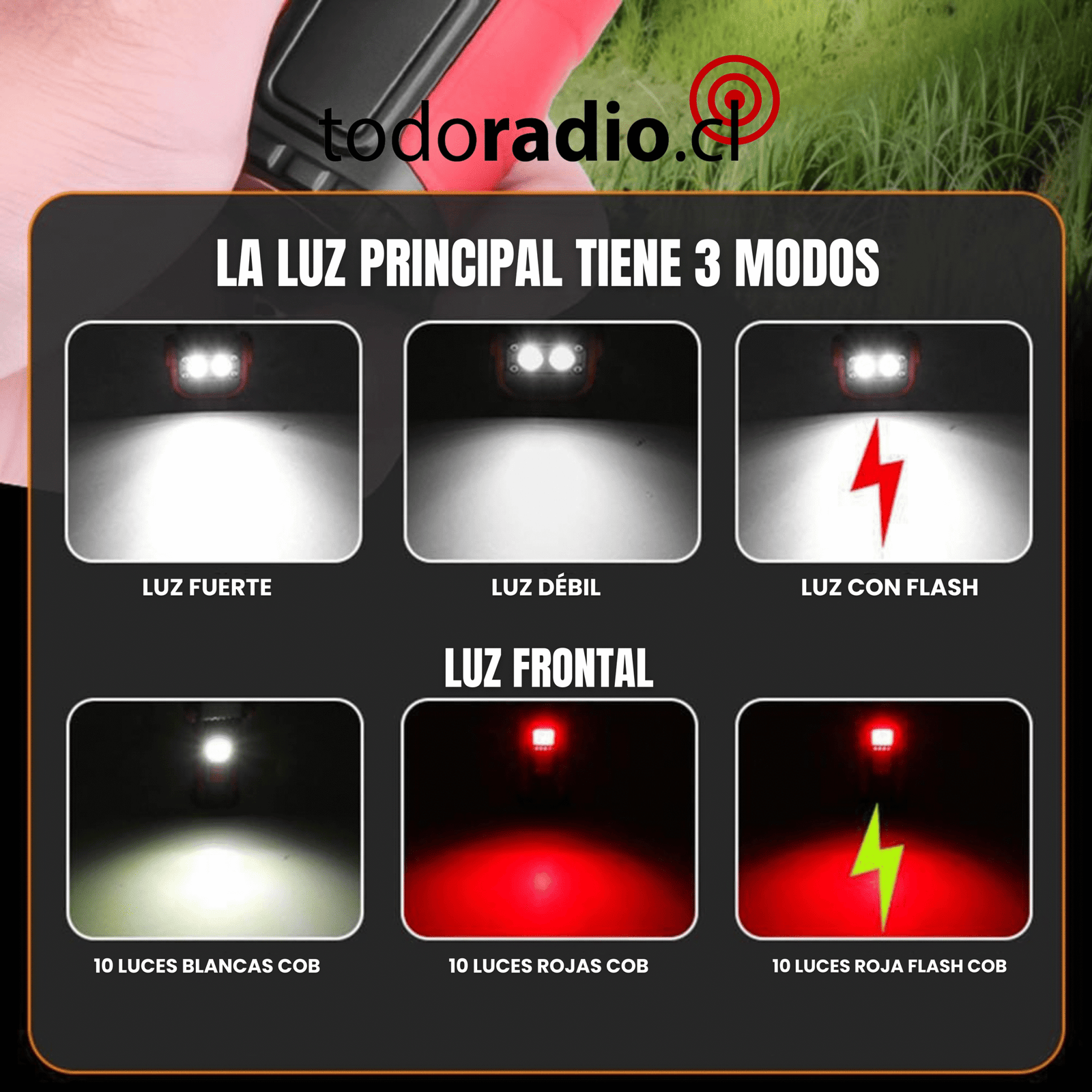 Su foco principal tiene 3 modos de luz: FUERTE, SUAVE , STROBE