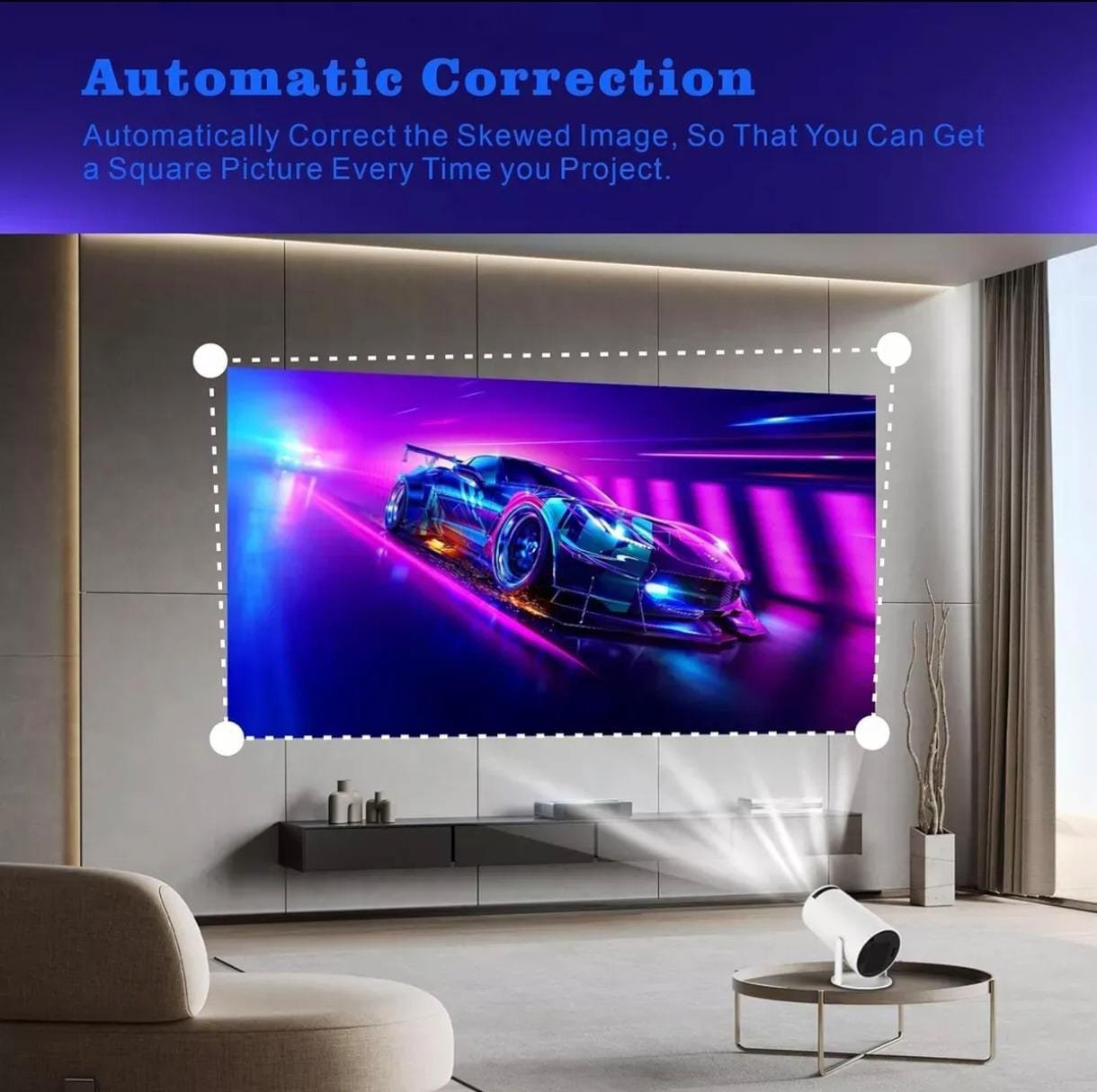 Corrección trapezoidal automática; El mini proyector utiliza la tecnología de enfoque manual y corrección trapezoidal automática con un sensor de alta precisión incorporado que detecta el movimiento en tiempo real para un enfoque más rápido y preciso. Utilice el enfoque manual después de encender el proyector. La corrección trapezoidal automática corrige automáticamente la imagen hacia arriba y hacia abajo. Para ajustar la proyección de lado a lado, utilice el mando a distancia.