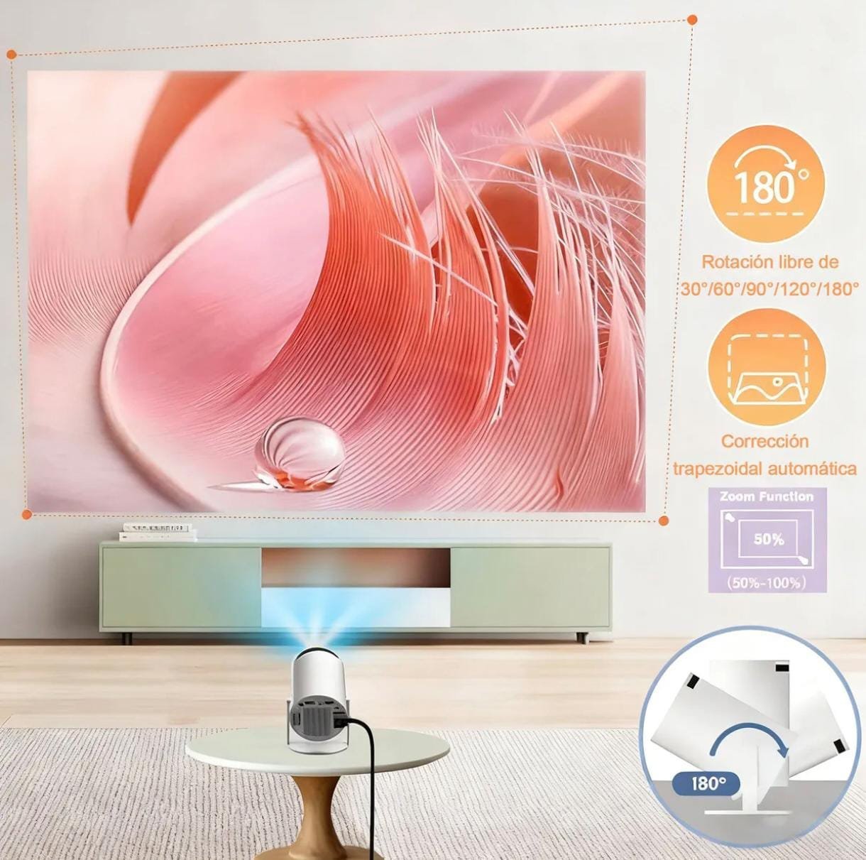 Versátil proyector inteligente; Este versátil PROYECTOR inteligente es fácil de llevar: el soporte gira casi 180 grados, para que puedas colocar la imagen donde quieras, desde el suelo hasta el techo. Te ofrece la flexibilidad de ver tus imágenes favoritas en la gran pantalla de hasta 130 pulgadas.